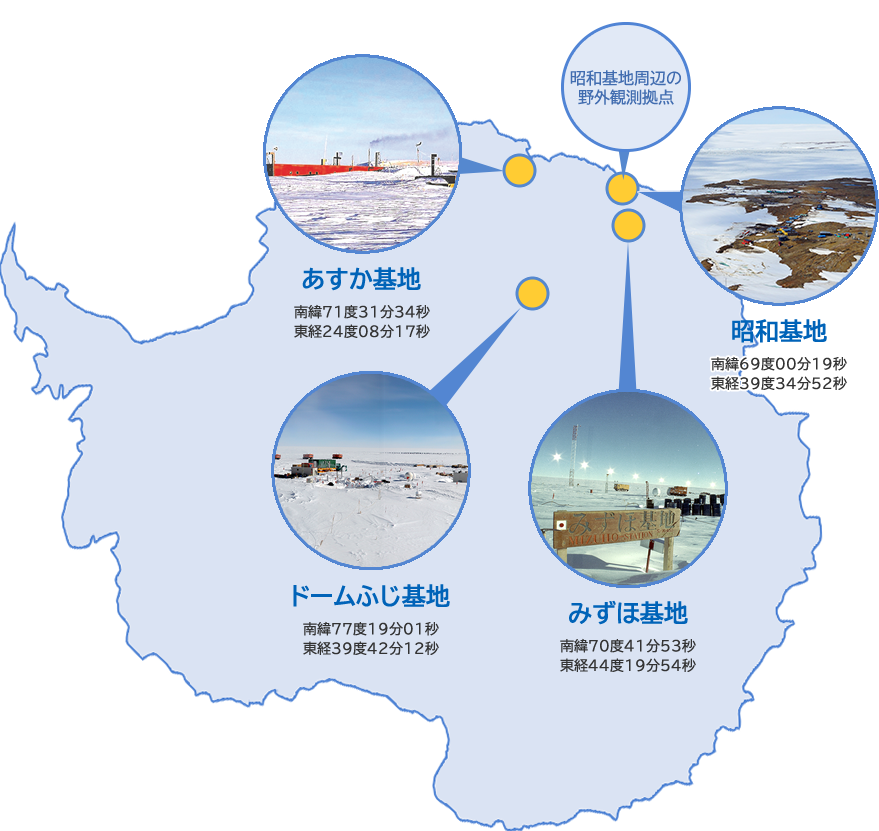 Японские антарктические станции (с правой верхней): Сёва, Мидзухо (みずほ基地), Купол Фудзи (ドームふじ基地) и Асука (あすか基地)