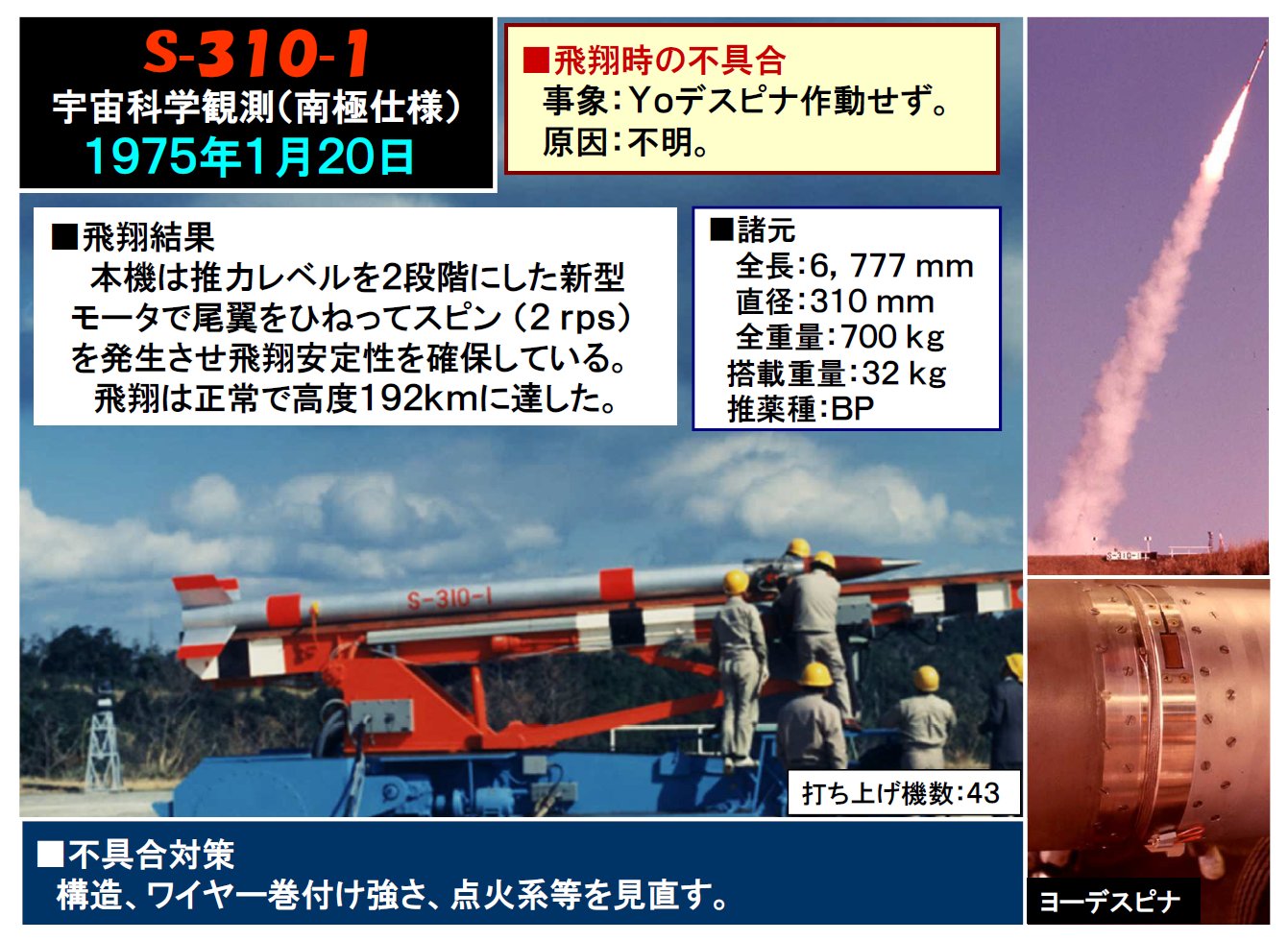 Первая S-310 взмыла в воздух 20 января 1975 г. Ей уступили место на небе «Каппа-8L» (カッパ8L型ロケット, K-8L), летавшая в 1962-1966 гг., и плохо себя показавшая S-300. Кроме удачного испытания прототипа PT-300-1, поднявшегося на высоту 160 км в 1966 г., в двух из трех пусков S-300 (1969 г.) наблюдалось аномальное увеличение угла атаки (angle of attack). Эту недоработку исправили при создании S-310…
