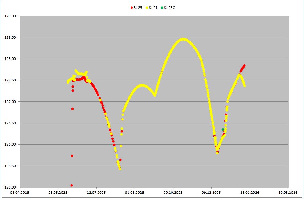 «Танцы» двух «Шицзяней» в период с июня 2025 по январь 2026 г. По вертикальной оси приведена долгота подспутниковой точки
