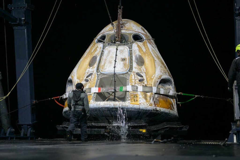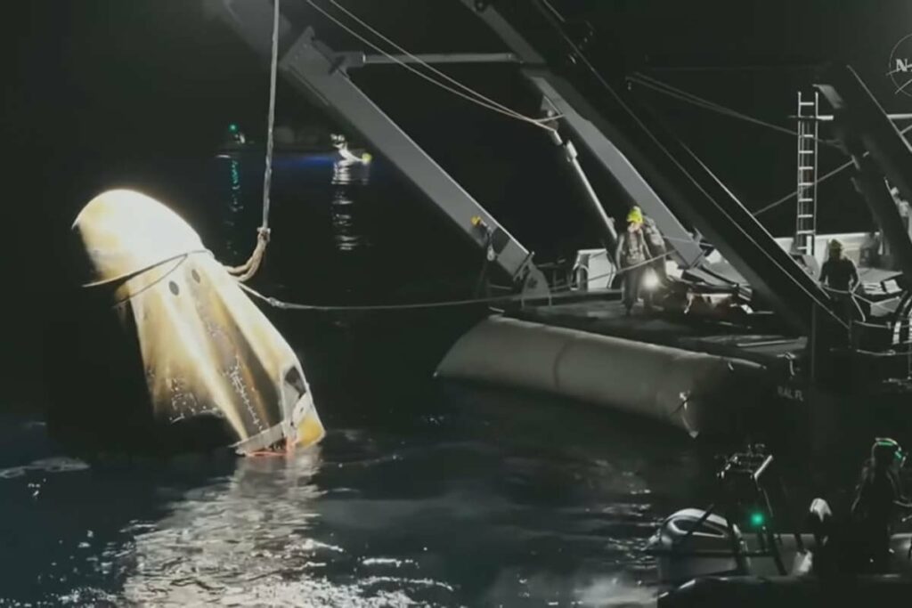 На Землю возвратились родившийся в Питтсбурге (штат Пенсильвания) Эдвард «Майк» Финк (Edward ‘Mike’ Fincke, 4-й полет, NASA), уроженка Эрбана (Иллинойс) Зина Кардман (Zena Cardman, 1-й, NASA), Юи Кимия (油井 亀美也, 2-й, JAXA) (https://novosti-kosmonavtiki.ru/articles/208588/), малая родина которого – село Каваками (Нагано), и челябинец Олег Платонов (1-й, Роскосмос). В 18:35 последнему из экипажа Crew-11 помогли выбраться из капсулы.